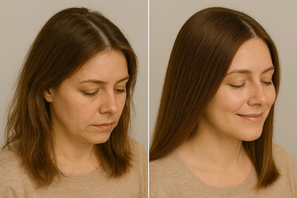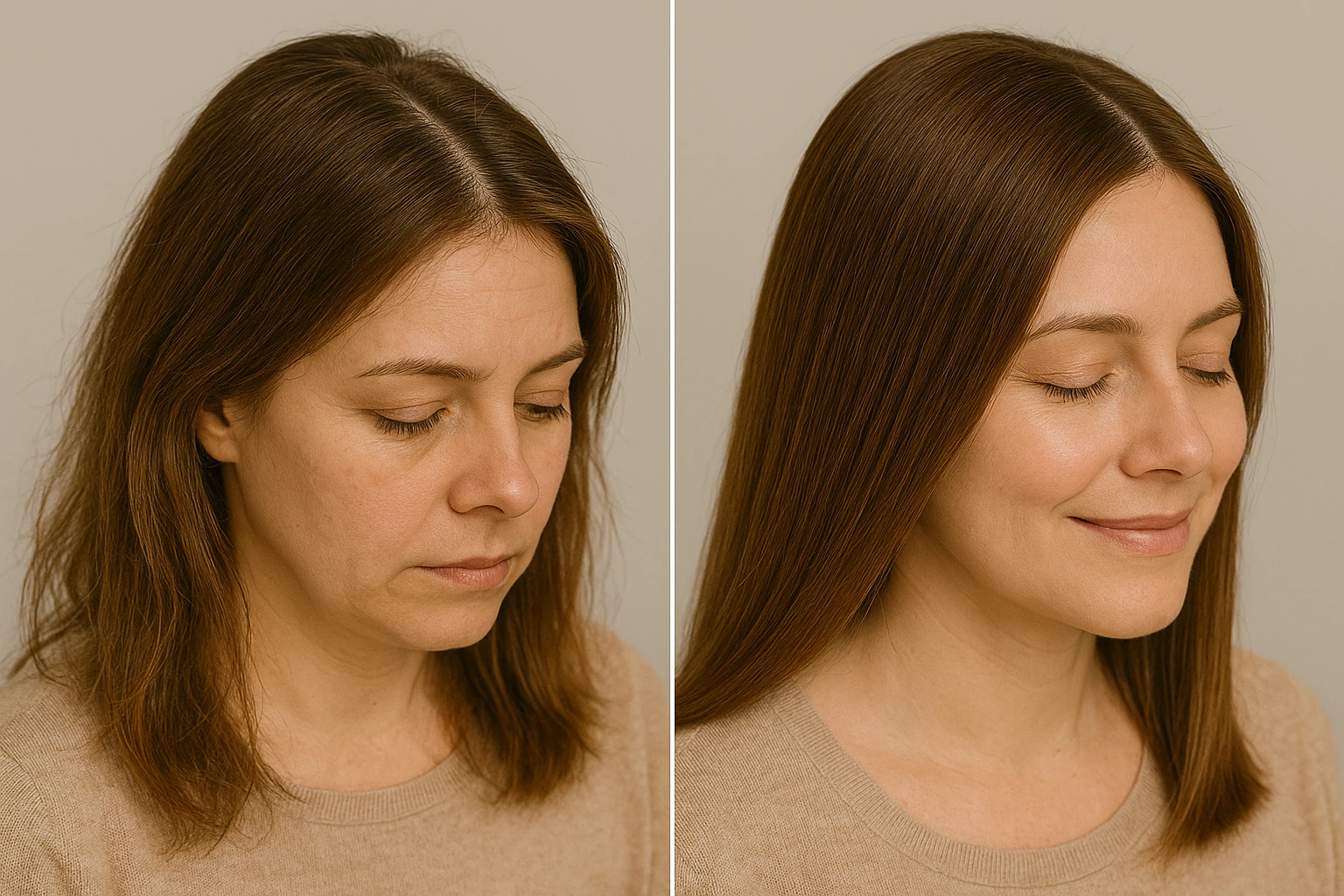 Na zdjęciu przed zabiegiem włosy są matowe, puszące się i wyraźnie przesuszone. Po zabiegu widzimy lśniącą taflę włosów o intensywnym kolorze i jedwabistej gładkości. Struktura włosa została wyraźnie odbudowana, a cała fryzura zyskała elegancki, zdrowy wygląd.