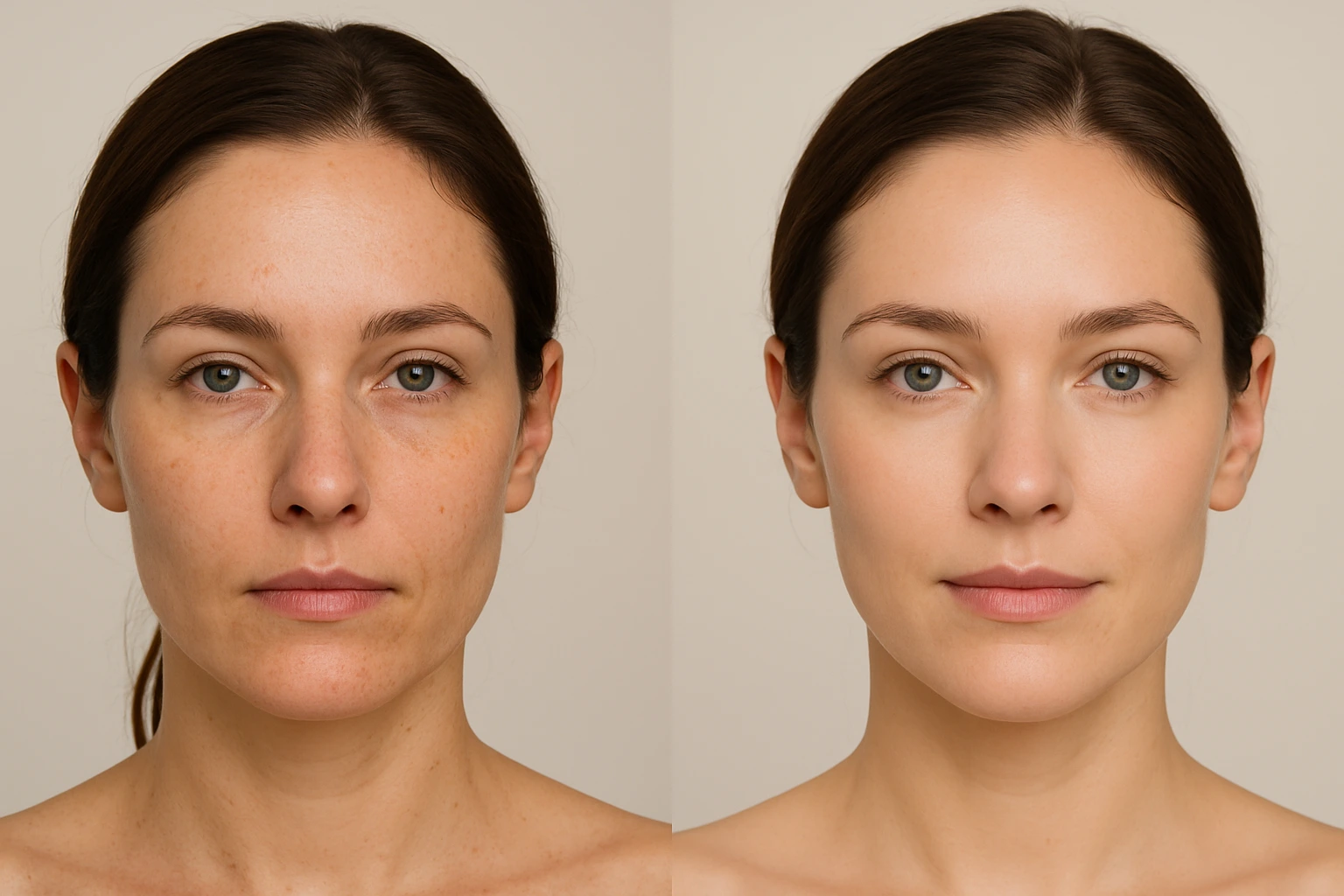 Na zdjęciu efektów po zabiegu Dives Med QPeel możemy zaobserwować subtelne, ale wyraźne zmiany w wyglądzie skóry. Przed zabiegiem cera była niejednolita, z lekkimi przebarwieniami, rozszerzonymi porami i drobnymi liniami mimiczno-starzeniowymi. Po zabiegu skóra jest wyraźnie wygładzona, bardziej napięta i promienna. Koloryt został wyrównany, pory są mniej widoczne, a struktura skóry sprawia wrażenie bardziej jedwabistej i świeżej. Efekt rewitalizacji jest naturalny, nieprzesadzony, idealny dla osób oczekujących odświeżenia i regeneracji bez radykalnych zmian.