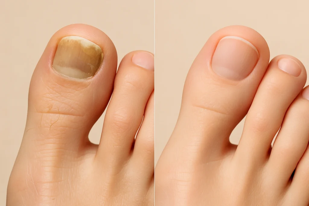 Na wizualizacji efektów „przed i po” widoczna jest wyraźna poprawa – paznokieć przed zabiegiem ma żółtobrązowe przebarwienia, jest matowy i zgrubiały. Po leczeniu płytka paznokciowa odzyskuje zdrowy, naturalny kolor i gładką strukturę, a skóra wokół niej wygląda na dobrze nawilżoną i zadbaną.
