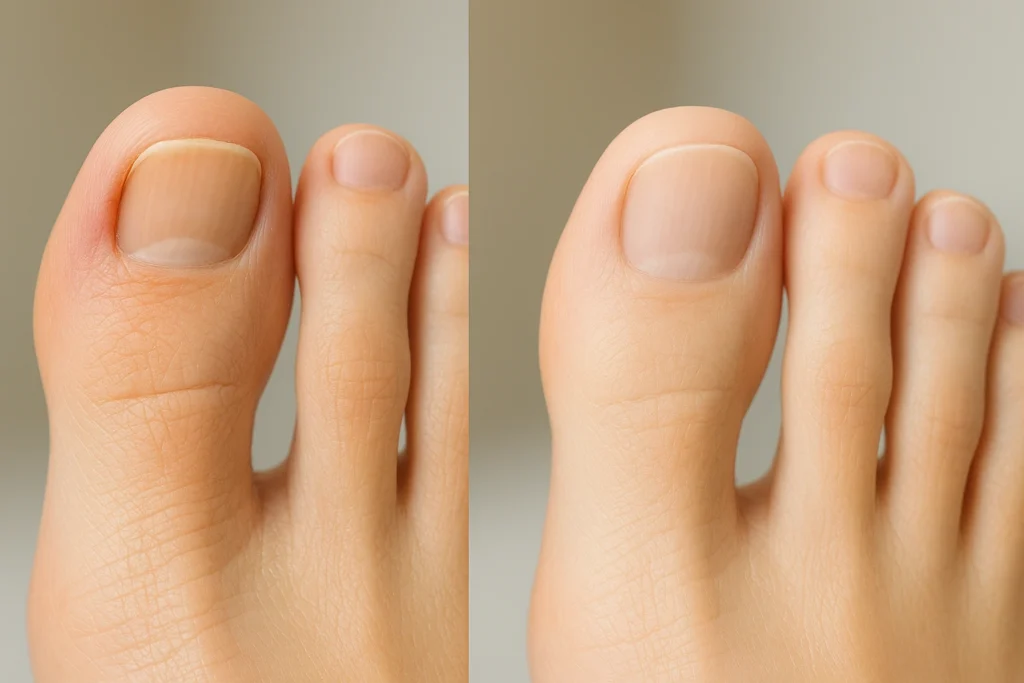 Na wizualizacji „przed i po” widać wyraźną poprawę – paznokieć przed zabiegiem wrasta w wał paznokciowy, co powoduje zaczerwienienie i zgrubienie skóry. Po terapii paznokieć przyjmuje prawidłowy, płaski kształt, a skóra wokół niego jest gładka, bez objawów zapalenia.