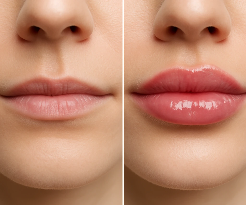 Modelowanie ust kwasem hialuronowym to jeden z najczęściej wybieranych zabiegów medycyny estetycznej – i nie bez powodu. Efekty widoczne na zdjęciu doskonale pokazują, jak delikatna ingerencja może subtelnie, a zarazem skutecznie poprawić proporcje twarzy i dodać ustom zmysłowego wyglądu. Na zdjęciu po lewej widzimy naturalne usta – z wyraźnie zaznaczoną strukturą, ale mniejszą objętością i delikatnymi liniami suchych warg.