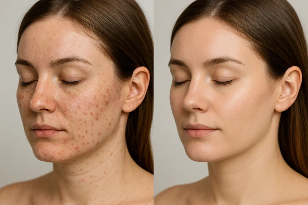 Na zdjęciu po lewej stronie widoczna jest skóra z wyraźnymi przebarwieniami, drobnymi bliznami potrądzikowymi oraz nierówną strukturą.