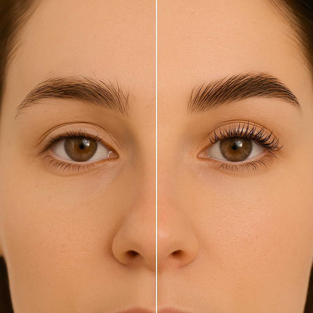 Po lewej stronie widoczne są naturalne brwi o nieco nieregularnym kształcie oraz proste, mniej widoczne rzęsy. Po prawej stronie spojrzenie nabiera wyrazistości dzięki idealnie wystylizowanej linii brwi i uniesionym, podkręconym rzęsom. Efekt końcowy to harmonijna i świeża oprawa oka, która nadaje twarzy promiennego wyglądu.