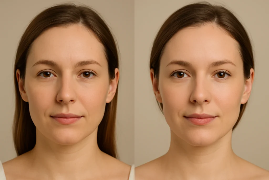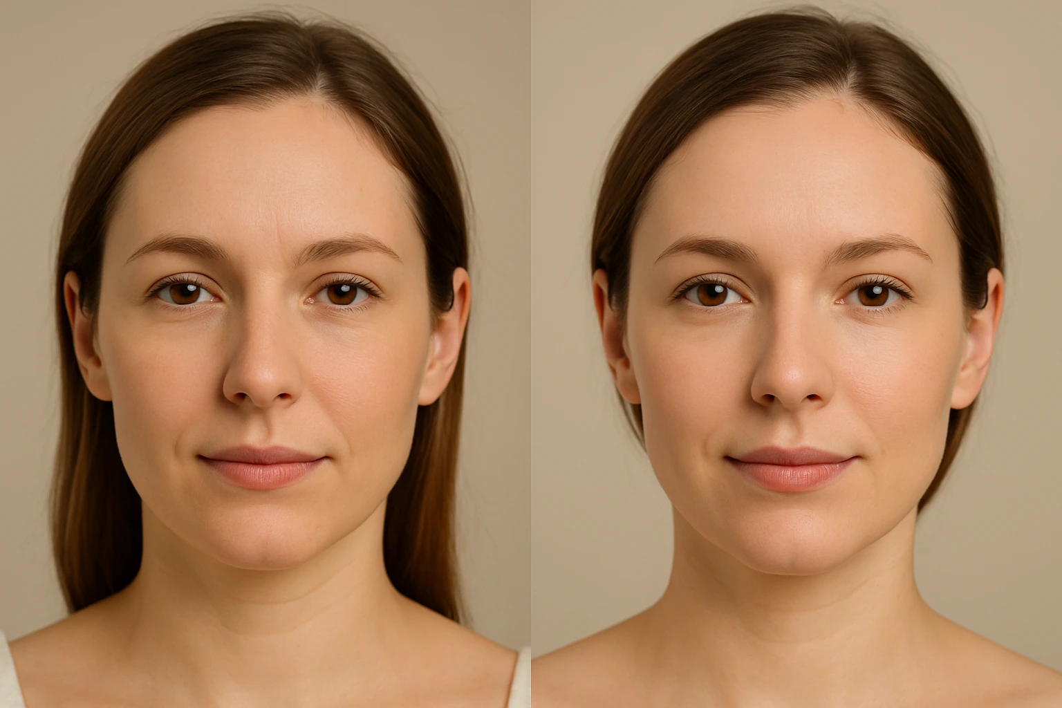 Na zdjęciu możemy zaobserwować subtelne, ale wyraźne różnice w kondycji skóry twarzy po zabiegu. Po lewej stronie widoczna jest cera z drobnymi niedoskonałościami – lekkie przesuszenie, delikatne zmarszczki i nierówny koloryt. Po prawej stronie, po przeprowadzeniu termoliftingu, skóra staje się bardziej wygładzona, zyskała świeżość, zdrowy blask i sprężystość, co przekłada się na ogólne odmłodzenie i wypoczęty wygląd.