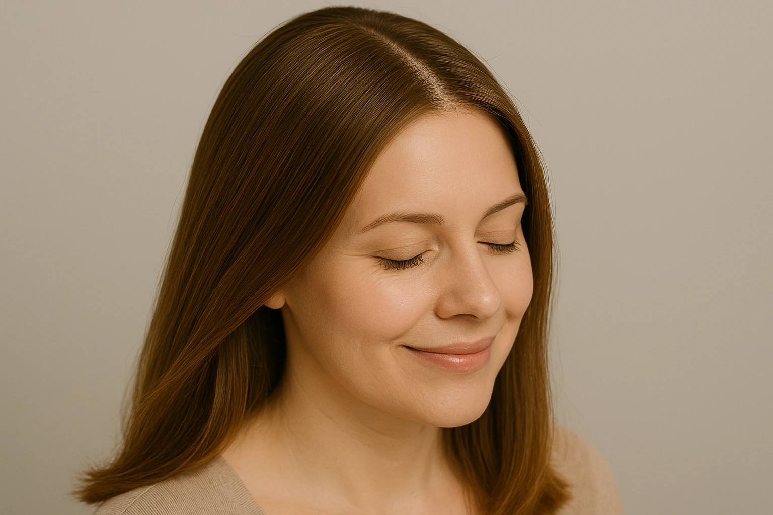 Na zdjęciu widzimy efekty jakich możemy się spodziewać po regularnej pielęgnacji trychologicznej i oczyszczania skóry głowy. Włosy prezentują się wyjątkowo zdrowo – są gładkie, błyszczące i pełne objętości. Przy skórze głowy widoczna jest świeżość i lekkość, co świadczy o skutecznym usunięciu zanieczyszczeń i nadmiaru sebum. Naturalny połysk oraz wyraźny, równy przedziałek podkreślają dobrą kondycję skóry i mieszków włosowych.