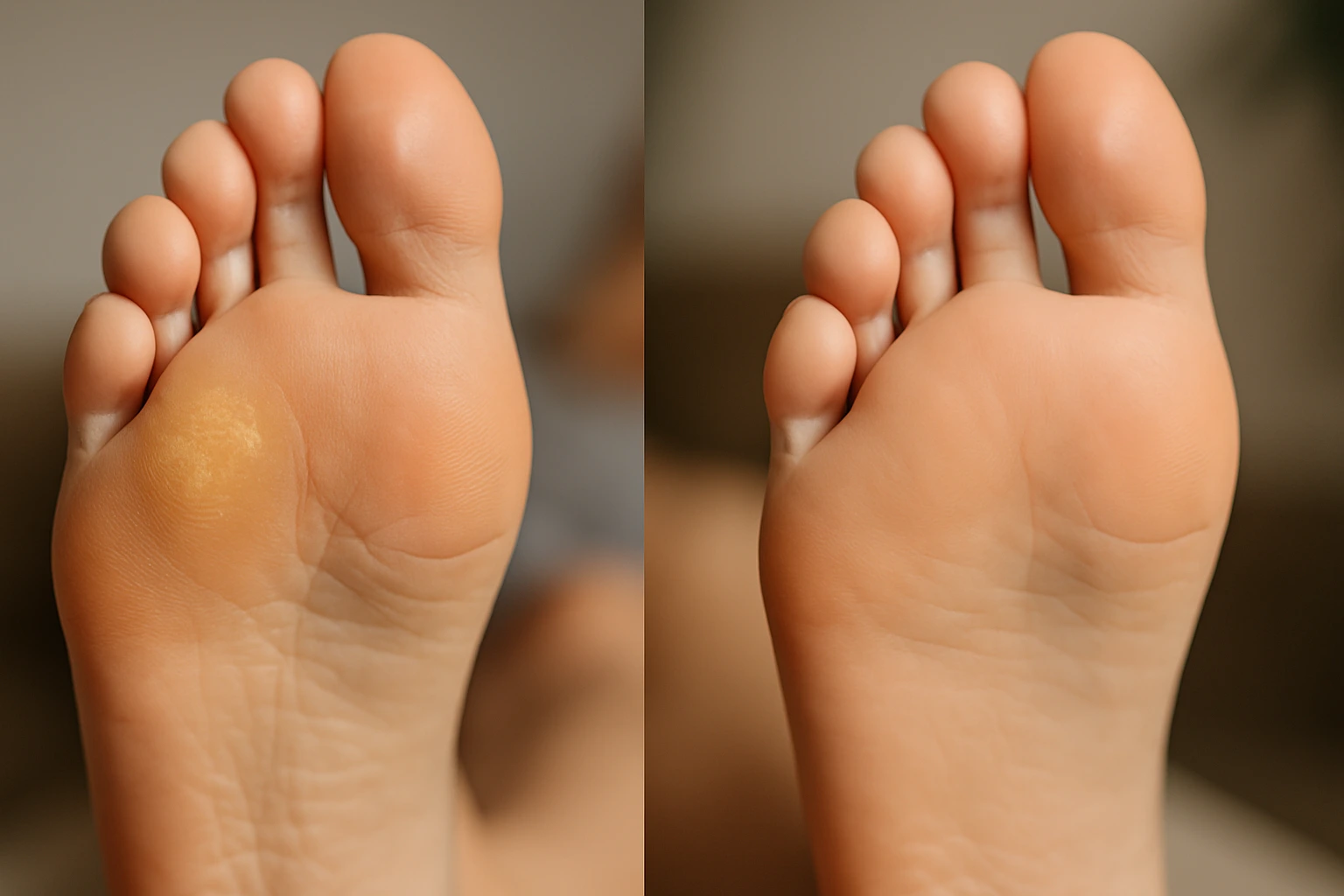 Po stronie „po” widoczna jest znaczna poprawa – skóra odzyskała naturalny koloryt i gładkość, a zgrubienie zostało całkowicie usunięte. Obszar przodostopia prezentuje się zdrowo i estetycznie, co przekłada się nie tylko na lepszy wygląd, ale także na komfort chodzenia i mniejsze ryzyko ponownego powstawania zmian.