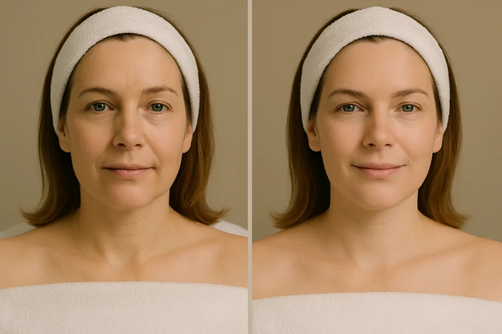 Na zdjęciu widzimy subtelne, ale zauważalne zmiany w wyglądzie skóry po zabiegu wielokierunkowej pielęgnacji Dr Grandel. Po lewej stronie cera jest lekko poszarzała, z delikatnymi oznakami zmęczenia i drobnymi liniami. Po prawej – skóra wygląda na świeższą, bardziej nawilżoną i wygładzoną, z wyrównanym kolorytem i naturalnym blaskiem. Efekt odmłodzenia jest delikatny, ale nadaje twarzy wypoczęty, zdrowy wygląd.